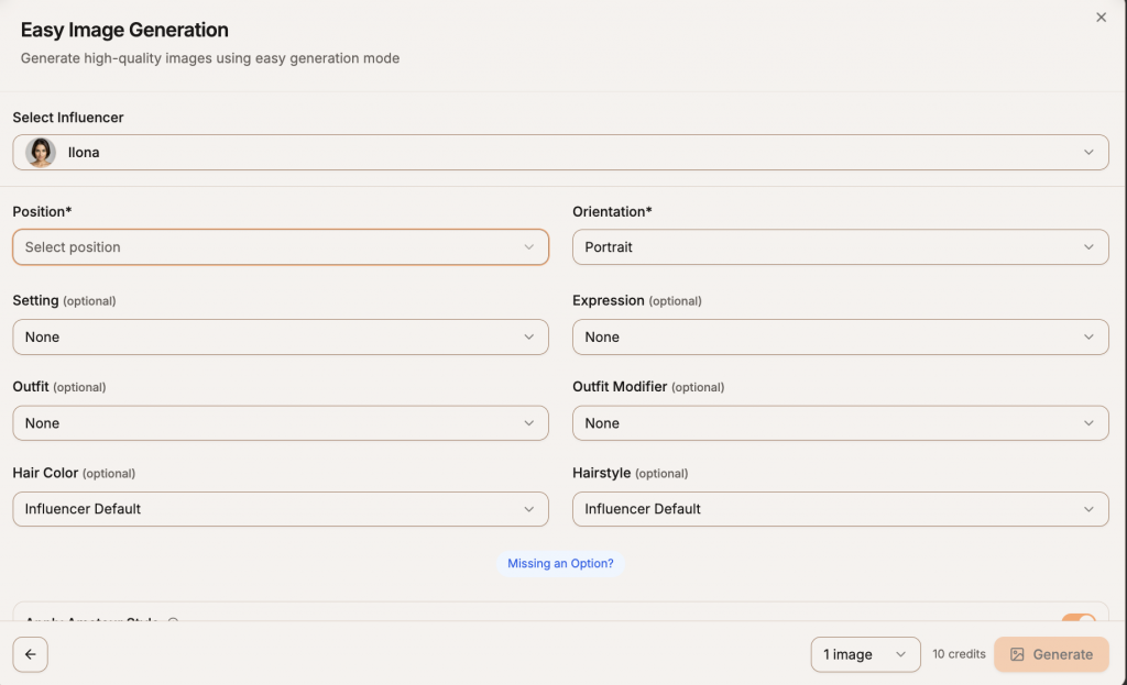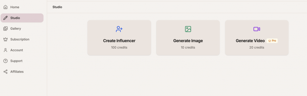 Ici, on va cliquer sur « Generate content » pour poursuivre l’aventure. Pour cela, on se rend sur le studio. L’interface nous laisse le choix entre trois choix de création : créer un autre influenceur, générer une image ou une vidéo. Chaque action coûte quelques crédits. En sachant qu’avec le forfait gratuit, vous avez 100 crédits gratuits. On clique sur « Generate image ».